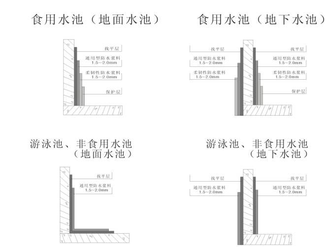 水池根據使用功能、環境條件(地面或地下)腐蝕情況,制定設防要求(按剖面圖)。
