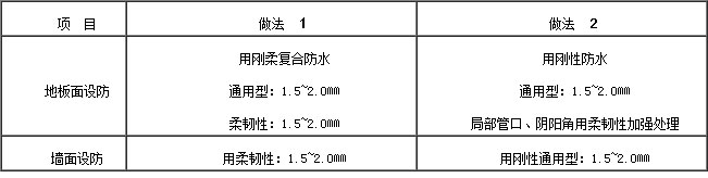 廚、浴、廁均應采用迎水面防水;地面防水層應設在結構層的找平層上面,墻體應做好防水抗滲處理,注意管口及陰陽轉角的處理,由于不受氣候影響,溫差變化不大,對材料的廷伸率要求不高,一般采用通用型防水,局部管口、陰陽角采用柔韌性加強(按剖面圖)。