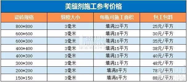 下面就給大家貼一家美縫劑施工的參考價(jià)格給大家(磚的大小會影響最終價(jià)格)